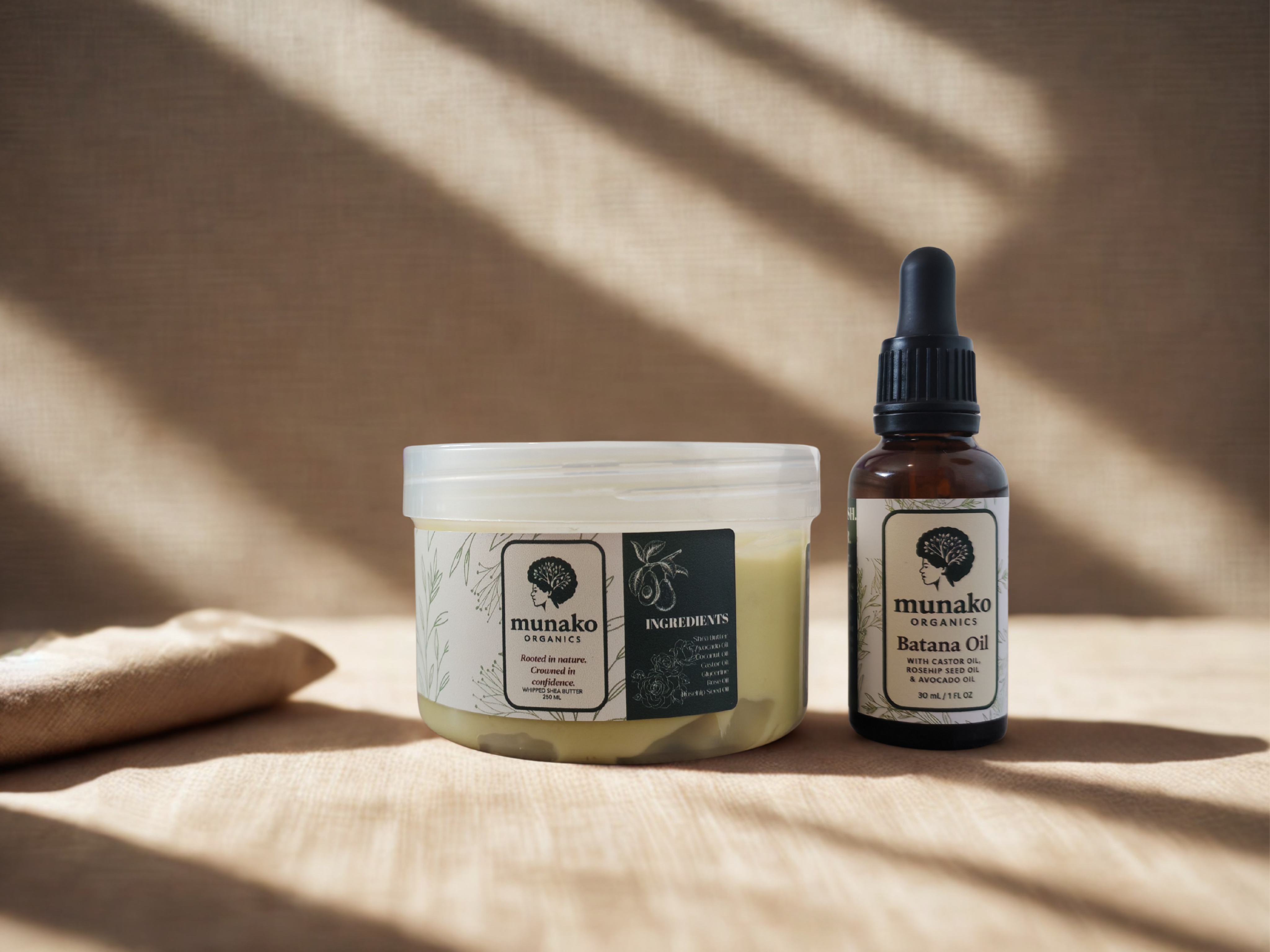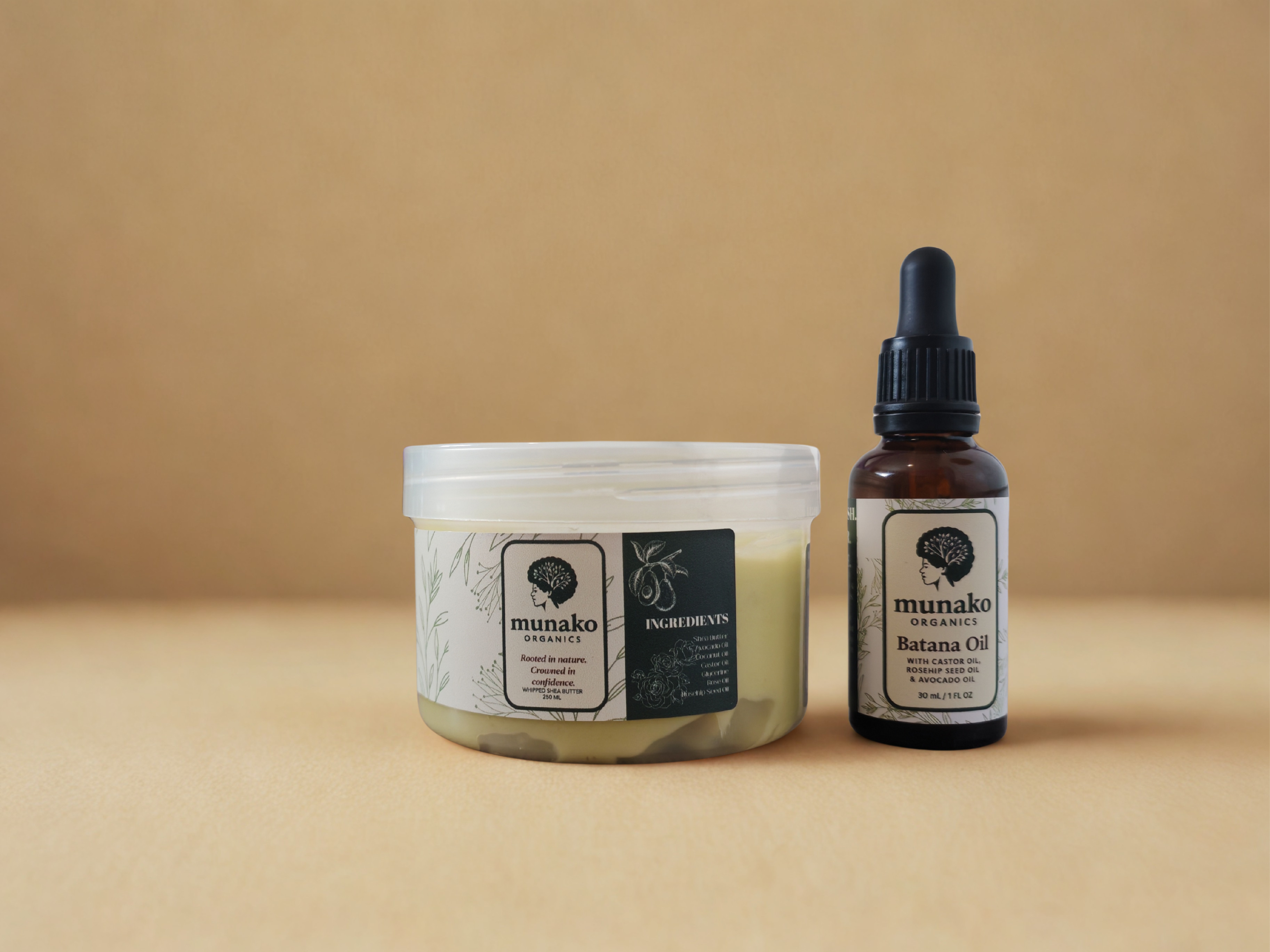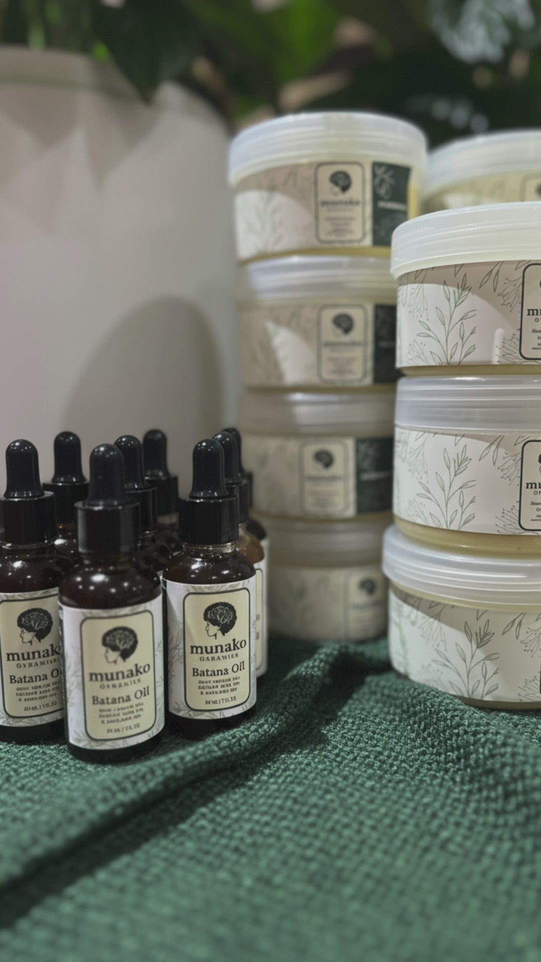Munako Organics combines a nutrient-rich Batana Growth Oil and a luxurious whipped Shea Butter to nourish the scalp, seal in moisture and improve manageability. Used individually or together, our formulas restore balance, promote shine and help protect hair from dryness, breakage and thinning. Making them ideal for textured hair and protective styles.
